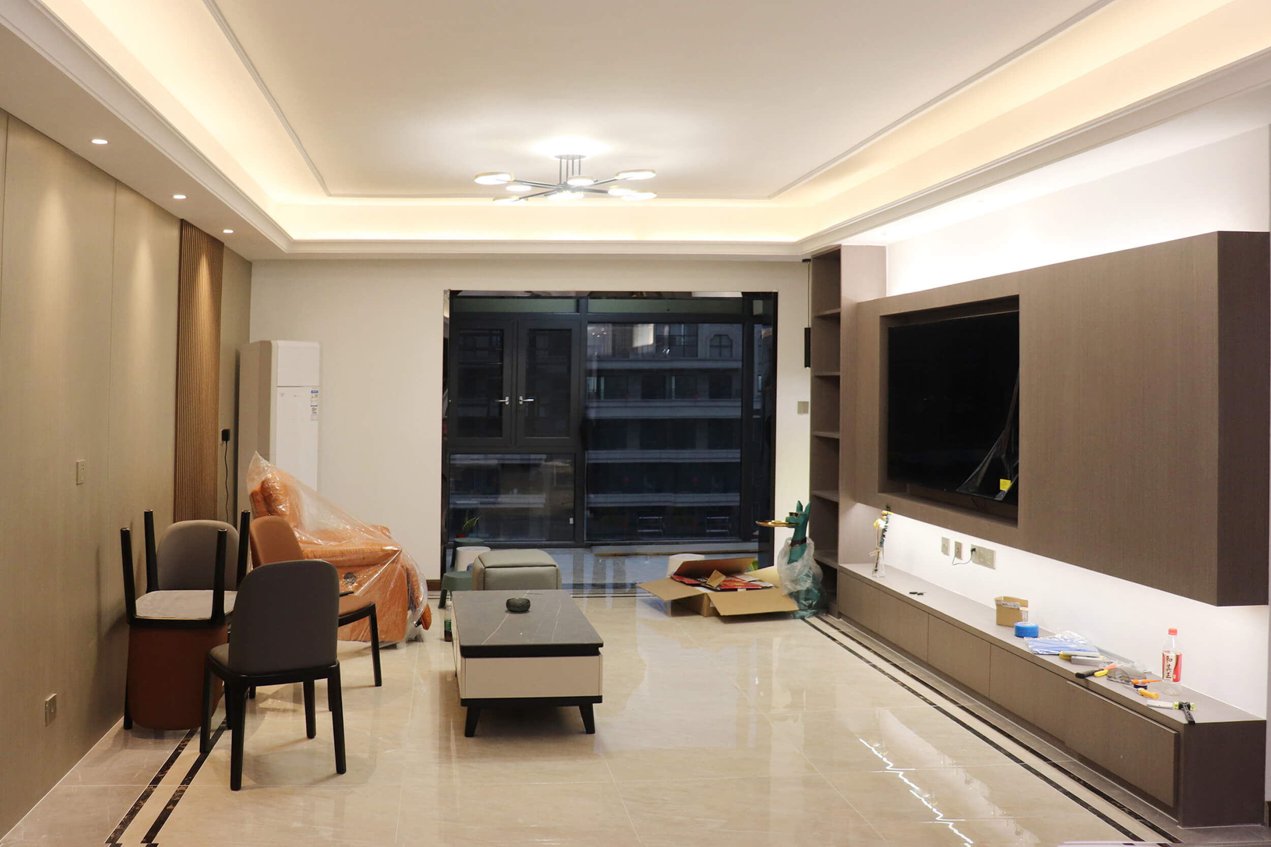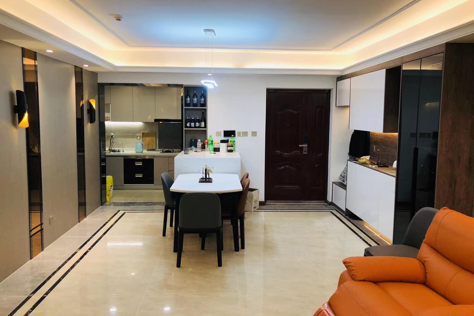 瀏覽量:341客餐廳選擇素色的木飾面顯現(xiàn)低調(diào)有內(nèi)涵,整個客廳及餐廳的吊頂直接一體貫穿,搭配著電視背景墻長方體設(shè)計(jì)突顯空間的寬闊大氣,愛馬仕橙色的窗簾及單人沙發(fā)的呼應(yīng),增添了空間的活躍性;暖黃色燈光下白色的大理石吧臺及白色的高光柜門使得空間不再昏沉,局部黑色的鈦金夾著茶色的鏡面在大面積的素色木飾面的包裹下將現(xiàn)代的低調(diào)且奢華體現(xiàn)完美的體現(xiàn)了。