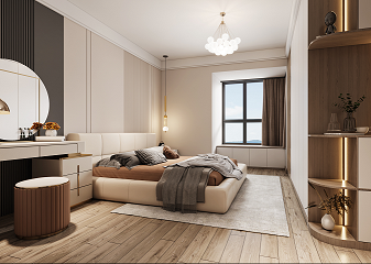 竹炭飾面護(hù)墻板做背景,是大空間設(shè)計(jì)元素在小空間的延續(xù)。主臥沒有做過多的造型,大量留白,通過軟裝設(shè)計(jì)師的巧手來營(yíng)造氛圍,利用不同色系與材質(zhì)對(duì)比組合形成精致豐盈的裝飾效果,風(fēng)吹簾動(dòng),琉光行云,主臥釋放著樂且晏如的溫柔情緒